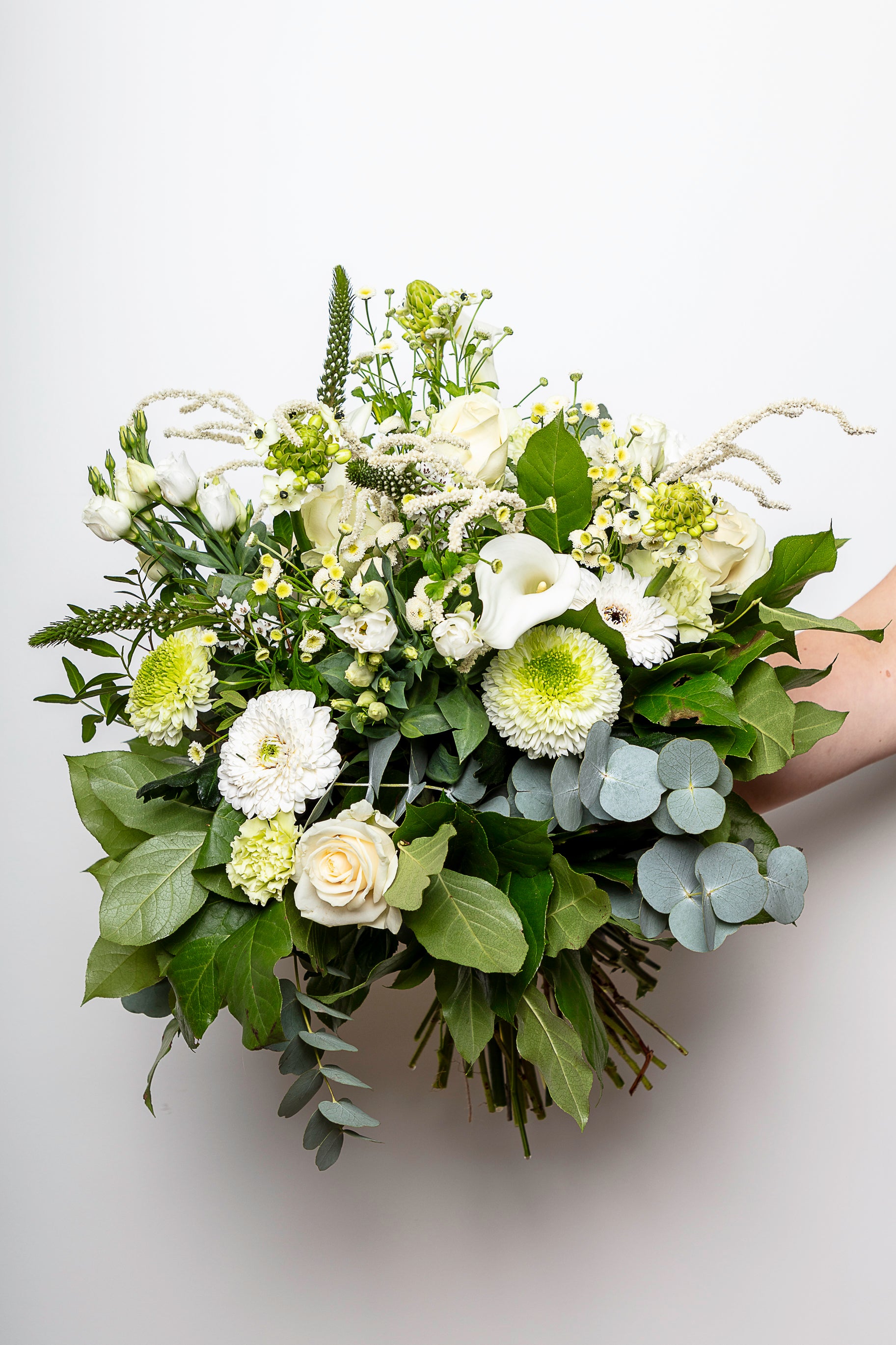 Een stijlvol wit boeket dat rust en klasse uitstraalt. Perfect om dankbaarheid of medeleven te tonen.