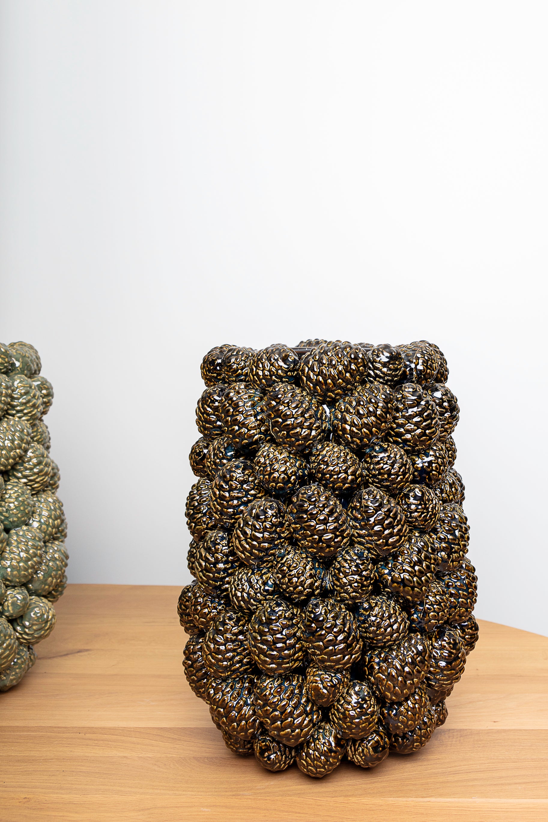 Een warme keramieken pot met een reliëf van dennenappels in zachte groen/gouden- of bruin/blauw-tinten.
