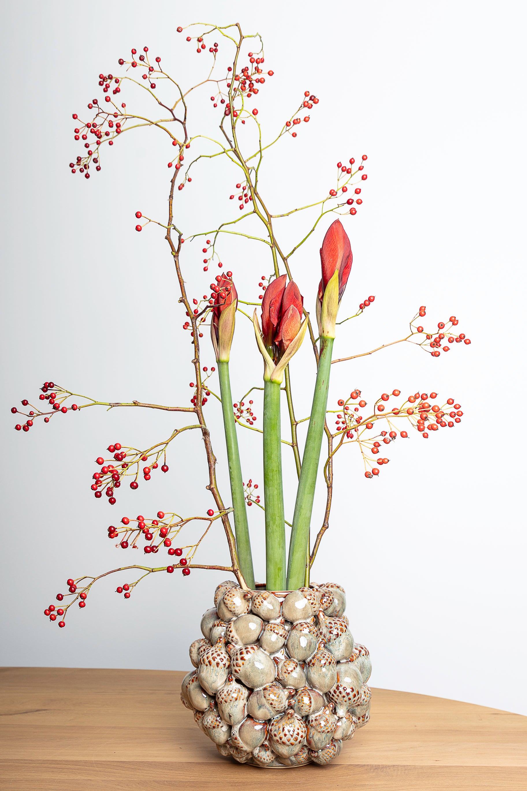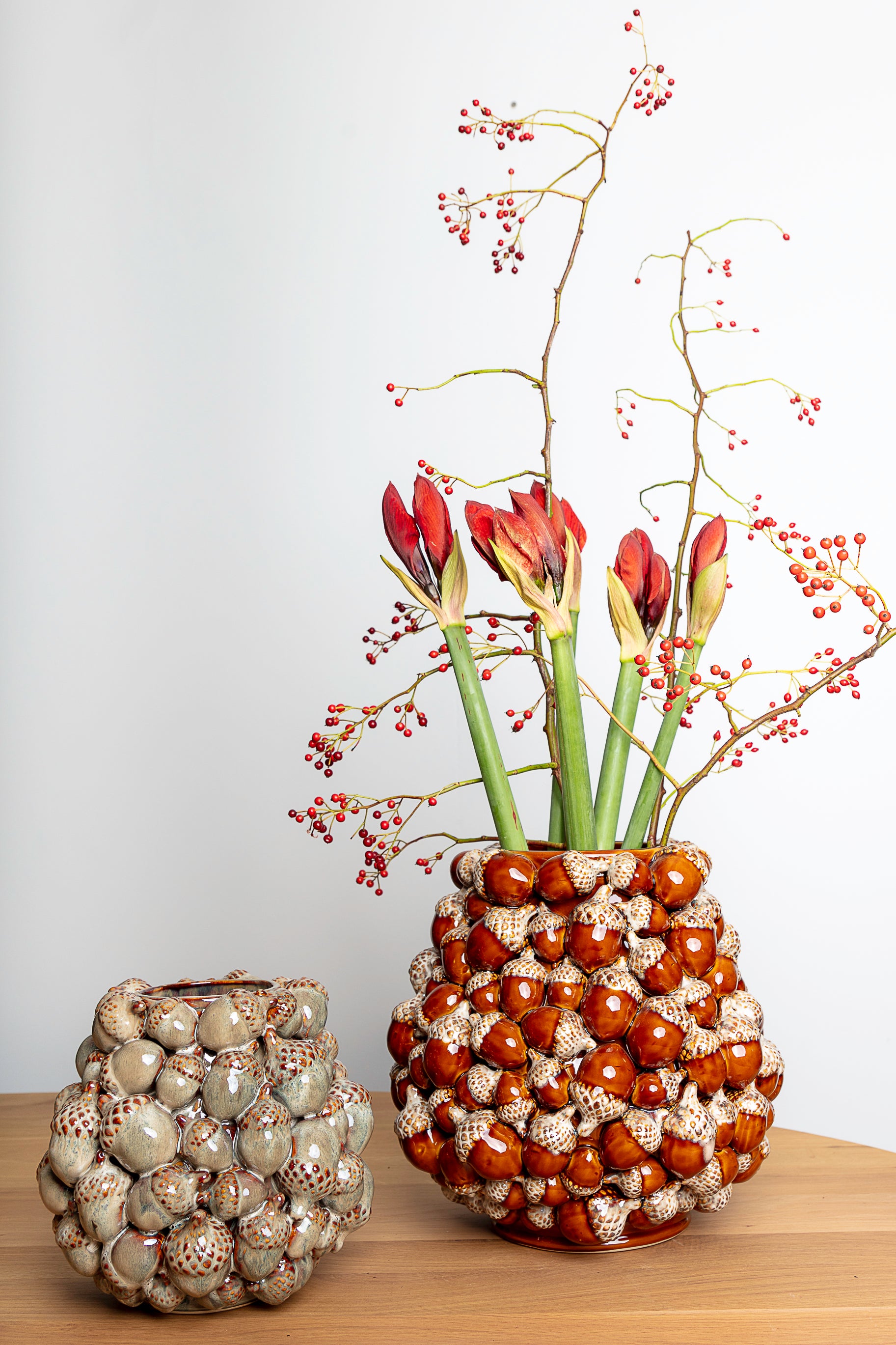 Een warme keramieken pot met een reliëf van eikels in glanzende grijs- of bruintinten. Een eerbetoon aan de natuur en haar rijke herfstkleuren.